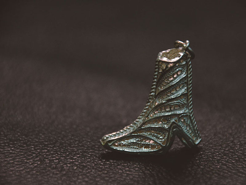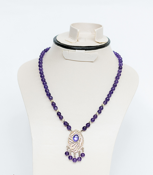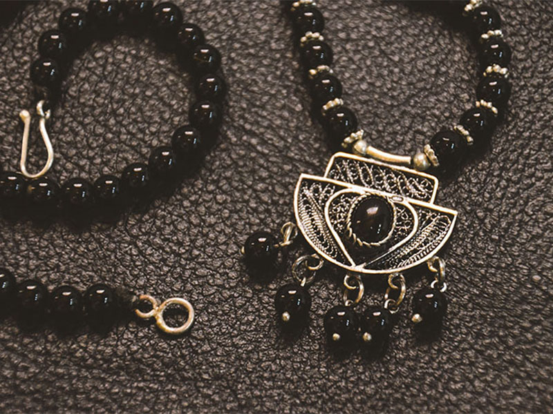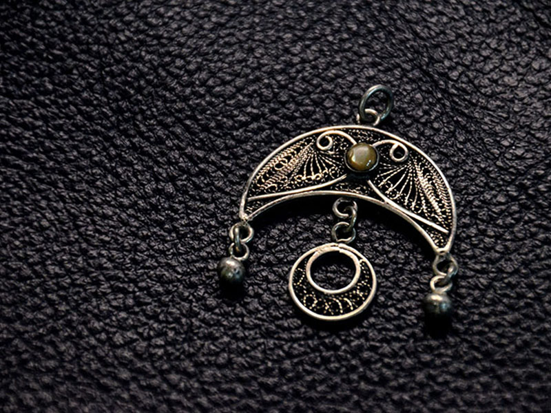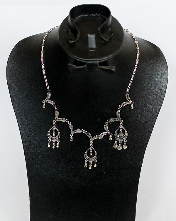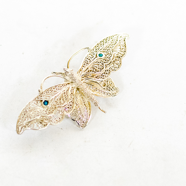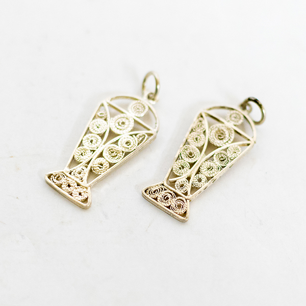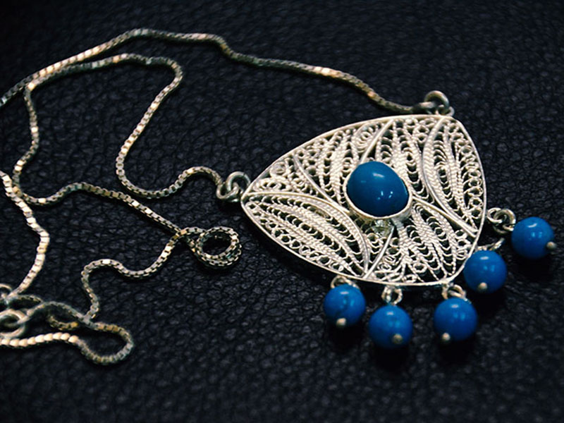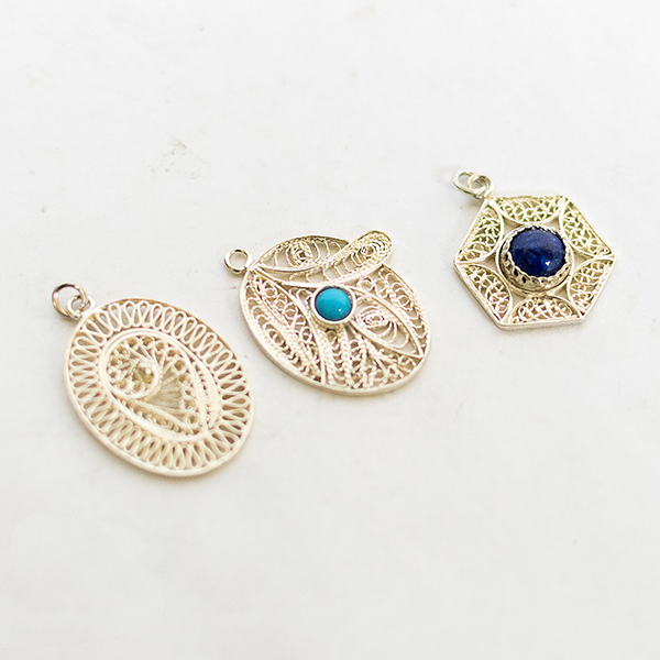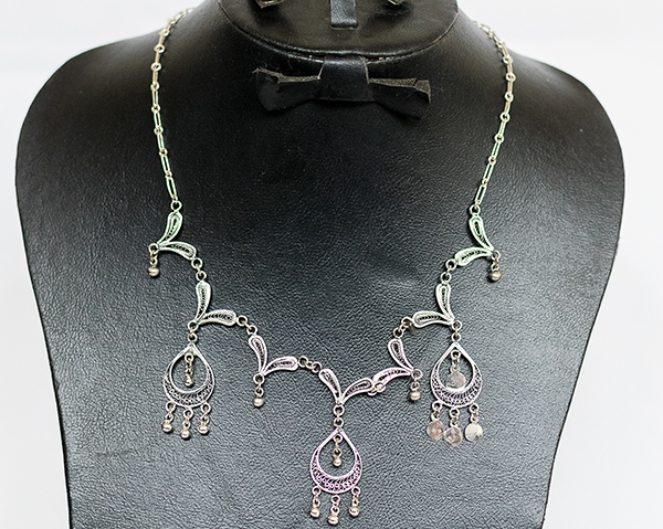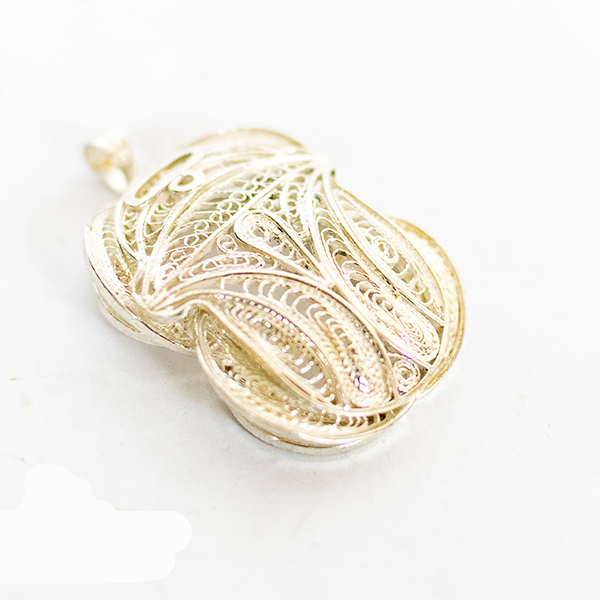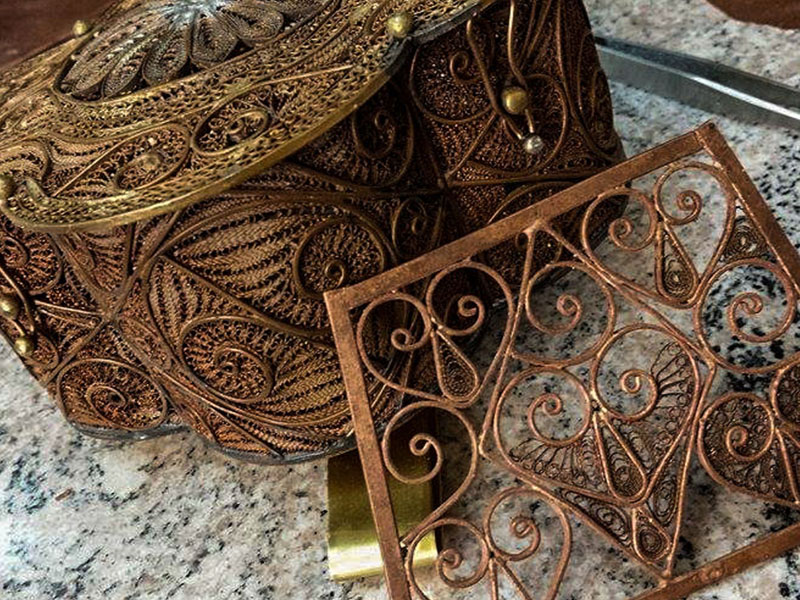 Filigree in jewelry , it is usually of gold ,sliver and copper made with tiny beads or twisted threads, or both in combination, soldered together or to the surface of an object of the same metal and arranged in artistic motifs.